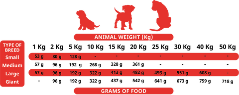 Consulte la tabla de necesidades diarias de alimento como punto de referencia, variando la cantidad de alimento según la edad, nivel de actividad física, peso o raza.