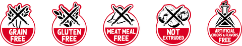 Libre de cereales, libre de gluten y libre de harinas cárnicas, de fabricación propia, empleando ingredientes naturales y frescos de categoría alimentaria humana. Lo más importante es que esta comida NO ESTÁ EXTRUSIONADA.